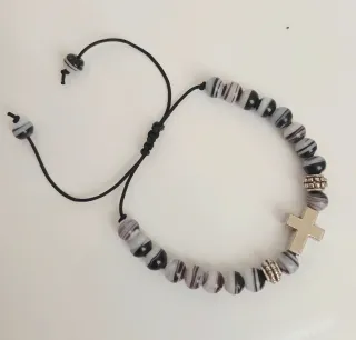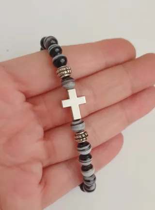 Nueva. Pulsera realizada con cuentas de ágatas estriadas naturales y un detalle central en forma de cruz. - Diseño único con ágatas estriadas en blanco y negro. - Adorno metálico entre las cuentas. - Cierre ajustable. No hago envíos, recoger por mi zona.