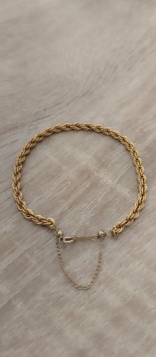 Se vende pulsera chapada en oro 14k GF tal cual aparece en las fotos, sin uso ninguno.Antes de comprar lea y mire atentamente las fotografías,realize las consultas que crea necesarias.vendedor con más de 60 valoraciones de 5 estrellas. Medidas 18cm aproximadamente cerrada,abierta 20cm aproximadamente