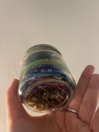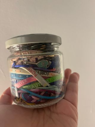 Lote de pulseras y abalorios surtidos. ¡Un pequeño tesoro para tu colección! - Incluye un tarro de cristal con tapa. - Más de 20 pulseras y abalorios de distintos colores y materiales. - Algunas pulseras tienen inscripciones como "Forever" o "Beauty". - Perfecto para regalar o para darte un capricho.