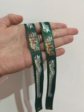Pack de dos pulseras de tela con diseño de la Virgen. - Diseño con la Virgen y detalles florales. - Tira de tela con estampado. - Acabado en color verde con detalles multicolores. - Virgen de la Piedad.