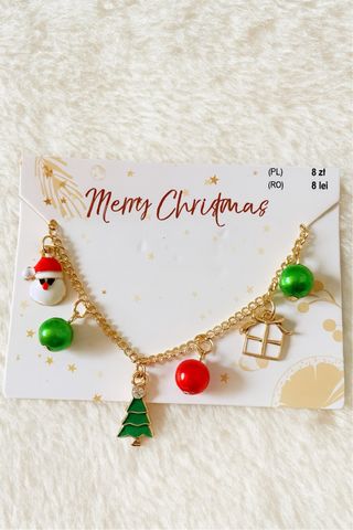 Pulsera dorada con encantadores charms navideños. - Charm de Santa Claus. - Charm de árbol de Navidad. - Charm de regalo. - Bolas decorativas rojas y verdes.