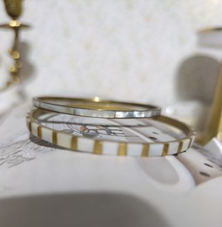 Conjunto de dos pulseras rígidas vintage. - Diseño con incrustaciones de nácar. - Acabado en tono dorado.