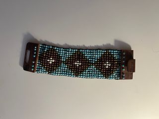 Pulsera artesanal con un diseño étnico y llamativo. - Cierre de madera. - Abalorios de cristal en tonos azul, marrón, dorado y blanco. - Detalles en madera en los extremos.
