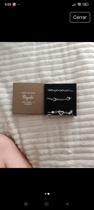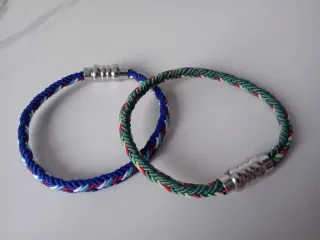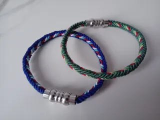 Conjunto de dos pulseras con un diseño trenzado y un cierre magnético. Pulsera con hilos azules, blancos y rojos. Pulsera con hilos verdes, rojos y blancos. Cierre de metal plateado. Son 5€ por las dos.