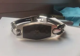 Elegante pulsera estilo brazalete con un diseño moderno. - Detalle central ovalado. - Combinación de materiales pulidos y texturizados. Pulsera Brazalete Diseño Moderno Acero y Cordón Negro con Ónice Preciosa pulsera brazalete con un diseño moderno y artístico que no pasará desapercibido. Es un accesorio ideal para darle un toque sofisticado y contemporáneo a cualquier look. Características Principales: Diseño Destacado: Estructura de metal plateado/cromado con líneas curvas que enmarcan una gran pieza central. Piedra Central: Gran cabujón negro pulido.