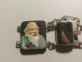 Leer bien le falta 2 enganches una tonteria El precio ya tiene encueta el desperfecto. Está hecha en metal plateado Pulsera Toshikane con eslabones que presentan 7 caras de estilo oriental. Diseñada en Japón en los años 70 (Imari) Es una pieza exclusiva para coleccionistas o amantes de joyas orientales Diseño único con 7 rostros artesanales de delicada porcelana de Arita pintados a mano. Elegante diseño de eslabones cuadrados con las imágenes de los dioses orientales de la fortuna Cierre perfecto Estado. Muy bien conservado Se ve la parte de delante Perfecta sin desperfectos no hay rayados pintura perfecta Precio la mas economic