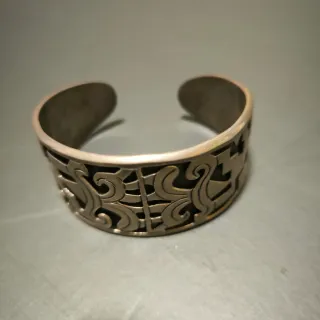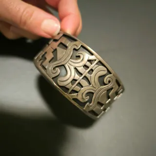 Pulsera vintage de plata 925, elaborada artesanalmente en Taxco, México. Su diseño intrincado y acabado plateado la convierten en una pieza única. Diseño geométrico azteca de Taxco - Diseño calado con motivos ornamentales. - Estilo abierto tipo brazalete. Medidas: 6,5cm x 5,5cm ancho 3,2cm