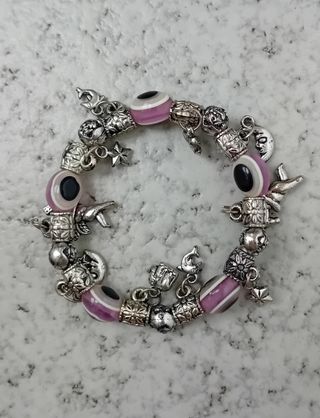 Pulsera de mal de ojo morada y piezas colgantes de segunda mano en buen estado.