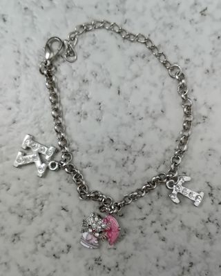 Pulsera de plata de la marca Pandora ,completa con varios Charm El cierrede seguridad es un corazón con alas. Tiene: - Un charm con forma de corazón de color rojo y piedritas brillantes Dos letras de plata con brillo . La letra N y la letra E - Cierre de corazón con detalles. - Tope Adorno con pequeñas piedras rosas. Si interesa tambien se venden los charm x separado . Se vende tambien la pulsera sola 45€ 150 € Pulsera Entera (incluidos charm)