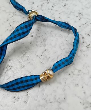 Pulsera de tela con pieza central de calavera y cierre decorativo. Prenda de segunda mano en muy buen estado. - Cinta con estampado de cuadros. - Cierre con cuentas plateadas. - Detalle de calavera dorada.