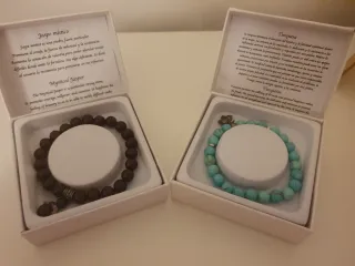 Conjunto de dos pulseras, una de jaspe místico y otra de turquesa, presentadas en sus cajas originales con descripciones. - Pulsera de jaspe místico. - Pulsera de turquesa. - Incluye cajas con información sobre las piedras.