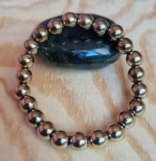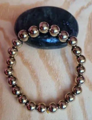 Elegante pulsera hecha a mano con cuentas de pirita dorada natural. - Diseño con cuentas esféricas, 8 mm. La pirita es un símbolo espiritual, asociada al chakra plexo solar, nuestro centro de poder personal, ayudando a equilibrarlo y armonizarlo, atrae abundancia y prosperidad. - Acabado metálico brillante.