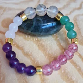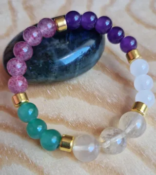 Pulsera de piedras naturales, 8 mm con un diseño vibrante y energético que favorece la atracción de suerte y prosperidad. Perfecta para recibir el año nuevo. - Cuentas de amatista. - Cuentas de jade. - Cuentas de cuarzo rosa. - Cuentas de cuarzo blanco - Separadores dorados.
