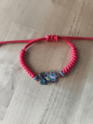Preciosa pulsera para niñas. Es de color rojo y presenta detalles multicolor. Largo mínimo 13 cm - Está elaborada con una cuerda roja trenzada, regulable. - Tiene un dije con un diseño colorido.