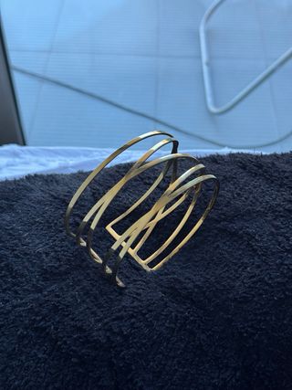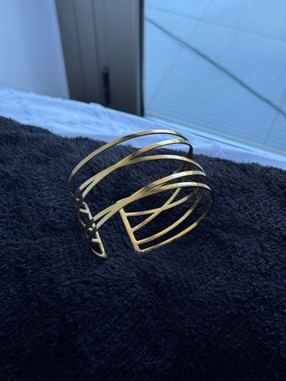Elegante brazalete de acero inoxidable con un diseño moderno y abierto. - Acabado metálico brillante. - Estructura con múltiples tiras entrelazadas. - Diseño abierto para fácil ajuste.