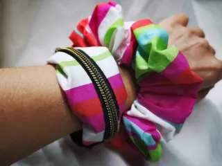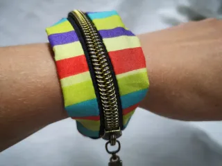 Conjunto de accesorios de moda que incluye una pulsera monedero y un coletero. - Pulsera con cremallera dorada. - Tejido con rayas multicolor vibrantes.