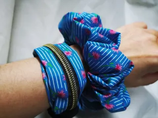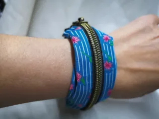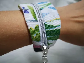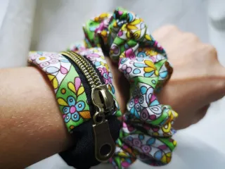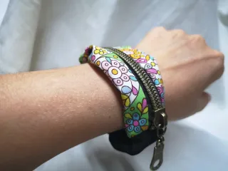 Conjunto artesanal que incluye una pulsera con cremallera y un coletero. - Diseño floral multicolor sobre fondo blanco. - Pulsera con cremallera plateada. - Coletero a juego con el mismo estampado.