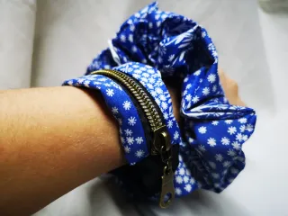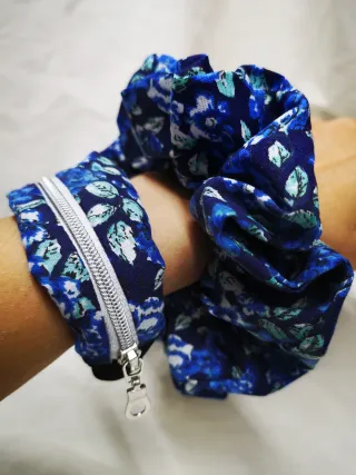 Conjunto de accesorios a juego con un diseño floral sobre fondo azul y detalles dorados. - Pulsera monedero con cremallera. - Coletero a juego.