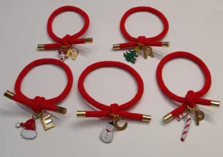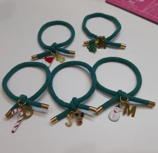 Pulseras elásticas con detalles navideños. Elige color y colgantes - Colgantes variados (de acero inoxidable): reno, árbol de Navidad, gorro de Papá Noel, muñeco de nieve, bastón de caramelo. - Letras doradas de acero inoxidable - Cierre con nudo.