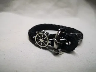 Pulsera de piel trenzada con detalles náuticos. - Diseño con ancla y timón. - Cierre de seguridad.