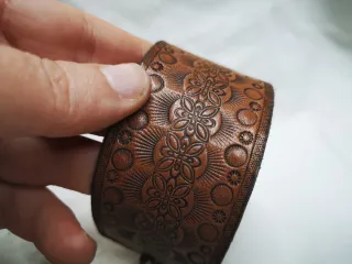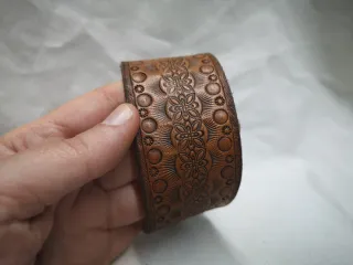Pulsera de cuero con un intrincado diseño repujado. - Elaborada en cuero. - Presenta un patrón de flores y motivos geométricos. - Tonos marrones oscuros. Para más información de otros productos de este estilo, visita mi catálogo de whassap en el 622579540, gracias.