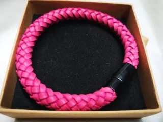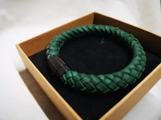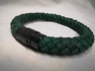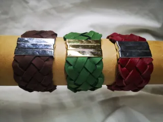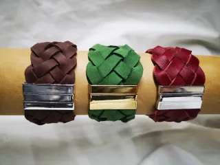 Pulsera trenzada ancha de piel, cierre metálico plateado y dorado, en Asero Inoxidable con Imán. Disponible en este momento estos modelos. Tres colores a elegir: Marrón, verde y rojo granate Si te interesa pregunta medidas y si kieres en otro tono pregúntame cual está disponible. Para más información de otros productos , visita mi catálogo de whassap en el 622579540, gracias.
