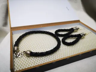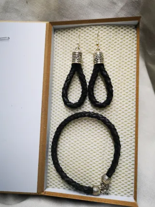 Elegante conjunto de Artesanía trenzada en piel - Pulsera con cierre de mosquetón. - Pendientes colgantes con enganche. - Diseño trenzado en piel. - Color: negro Para más información de otros productos de este estilo, visita mi catálogo de whassap en el 622579540, gracias.