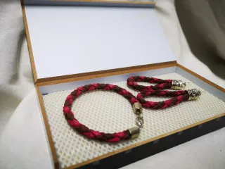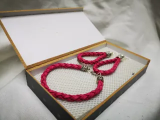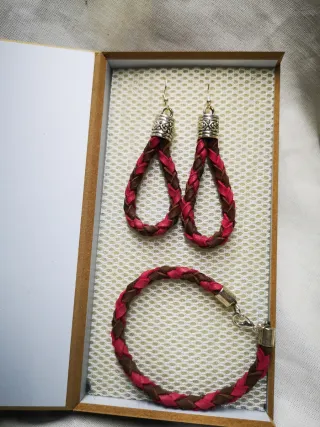 Conjunto Artesanal con un diseño trenzado. - Pulsera y pendientes a juego. - Elaborado con piel. - Cierre de mosquetón en la pulsera. - Color: marrón y rosa Para más información de otros productos de este estilo, visita mi catálogo de whassap en el 622579540, gracias.