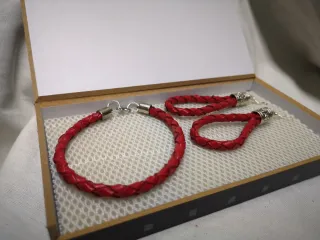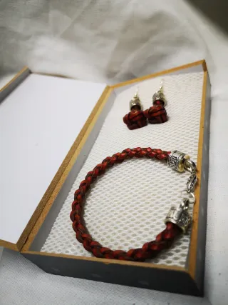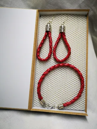 Elegante conjunto de Pendientes y Pulsera - Pendientes con diseño trenzado. - Pulsera a juego con cierre de mosquetón. - Detalles metálicos plateados. - Color: rojo Para más información de otros productos de este estilo, visita mi catálogo de whassap en el 622579540, gracias.