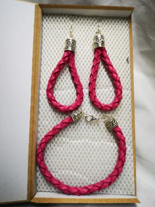 Precioso conjunto de pulsera y pendientes con un diseño trenzado. Producto Artesanal - Material: Piel trenzada. - Cierre de mosquetón en la pulsera. - Adornos metálicos plateados. - Color Rosa Para más información de otros productos de este estilo, visita mi catálogo de whassap en el 622579540, gracias.