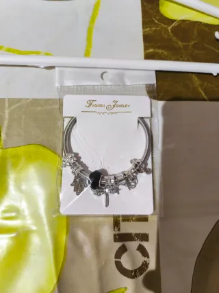 Elegante pulsera para mujer con varios charms. - Diseño de eslabones plateados. - Incluye charms como mano de Fátima, trébol, corazón negro y clave de sol.