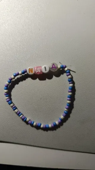 Pulsera hecha a mano con cuentas de colores y letras. - Diseño personalizado con el nombre Naia. - Combinación de cuentas moradas, blancas y azules.