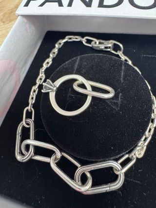 Conjunto de pulsera y charm de Cásate Conmigo de la marca Pandora. - Diseño de eslabones tipo link. - Acabado plateado.