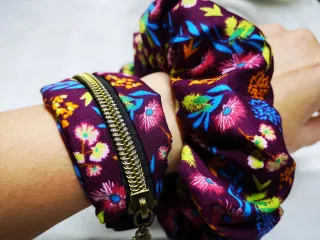 Conjunto artesanal compuesto por una pulsera con monedero y un coletero. - Pulsera con cremallera dorada. - Diseño floral multicolor sobre fondo morado.
