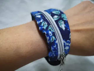 Conjunto artesanal de pulsera monedero y coletero con un bonito estampado floral. - Pulsera con cremallera plateada. - Coletero a juego. - Diseño floral en tonos azules.