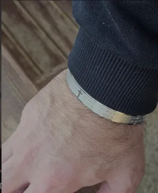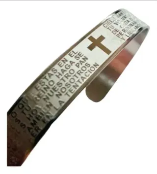 Pulsera de acero inoxidable con grabado de oración del padre nuestro y cruz. - Diseño elegante y duradero. - Grabado detallado de texto religioso. Precio NO NEGOCIABLE.