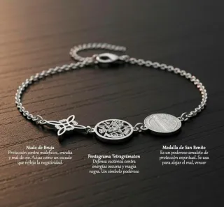 Elegante pulsera de acero con tres amuletos: un Nudo de Bruja, un Pentagrama Tetragrámaton y una Medalla de San Benito. - Nudo de Bruja: Protección contra maleficios, envidia y mal de ojo. - Pentagrama Tetragrámaton: Defensa esotérica contra energías oscuras y magia negra. - Medalla de San Benito: Amuleto de protección espiritual para alejar el mal.