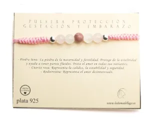 Pulsera ajustable para protección durante la gestación y el embarazo. Elaborada con plata 925. - Piedra luna: piedra de la maternidad y fertilidad, ayuda a tener partos fluidos y trata el amor. - Cuarzo rosa: representa la calidez, estabilidad y seguridad. - Rodocrosita: representa el amor desinteresado. - Hecho a mano.