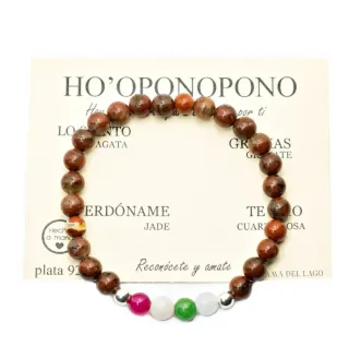 Pulsera Ho'opnopono elástica fabricada en jaspe rojo con dos bolas de plata de ley . La parte central consta de cuatro bolas de 6mm de distintos minerales: una de color azul: agata,Lo siento una de color granate : agata ,Gracias una de color verde: jade, Perdóname una de color rosa:cuarzo rosa,Te amo Reconócete y amate. Diseño único fabricado en España