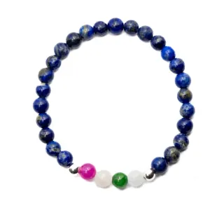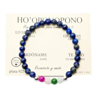 PULSERA HO'OPONOPONO LAPIS LAZULI ELÁSTICA La parte central consta de cuatro bolas de 6mm de distintos minerales: una de color azul: agata,Lo siento una de color granate : agata ,Gracias una de color verde: jade, Perdóname una de color rosa:cuarzo rosa,Te amo Reconócete y amate. Diseño único fabricado en España