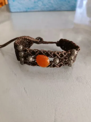 Es ajustable. También puede ser una tobillera. Pulsera de hilo con agata facetada en diferentes tonos marrones y naranjas y mineral ojo de tigre de 10mm en el centro. La pulsera es ajustable por lo que la talla es única y está terminada en bolas de plata de 3mm. El ojo de tigre se considera una piedra de creatividad, fuerza y equilibrio. Se dice que representa la unión entre la energía del Sol y la de la Tierra.Tradicionalmente el ojo de tigre se ha considerado una piedra protectora
