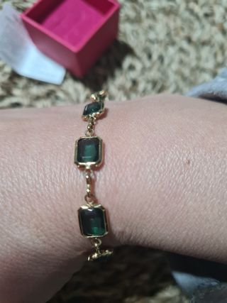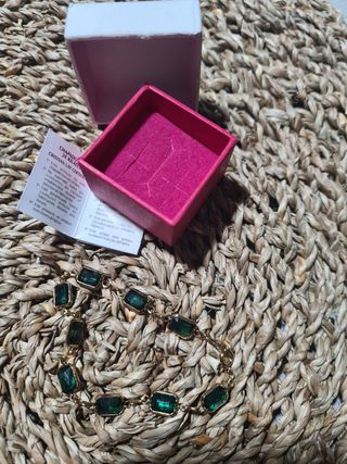Bonita pulsera con un diseño delicado y adornos. - Cadena dorada. - Dijes en forma de trébol. - Dijes con esmalte en varios colores: rojo, blanco, verde y rosa.