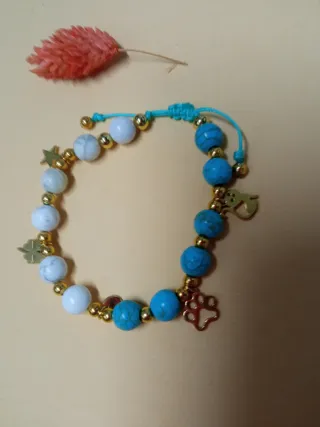 Pulsera artesanal con cuentas de jaspe blanco y turquesas. Un accesorio llamativo y elegante. - Cuentas de jaspe blanco. - Cuentas de turquesa. - Detalles dorados. - Charm de huella de perro. - Charm de trébol de cuatro hojas. - Charm de estrella. -Charm de gato. -Se entrega con su bolsa regalo