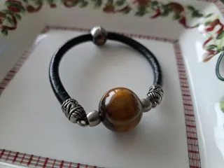 Pulsera con cordón de cuero negro y un llamativo ojo de tigre. - Cuentas metálicas decorativas. - Cierre seguro.