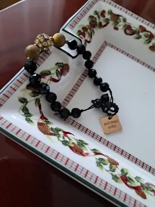 Elegante pulsera de la marca Antonio Miro con cuentas negras y detalles dorados. - Diseño con cuentas facetadas negras. - Elementos centrales en tono dorado. - Incluye charm con el logo de la marca.