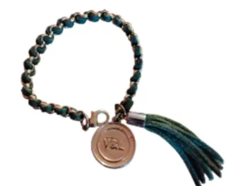 Elegante pulsera con un diseño trenzado y un detalle de moneda. - Acabado en dorado y verde. - Incluye un charm con el logo de la marca. - Adornada con un detalle de flecos.