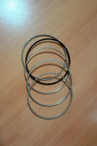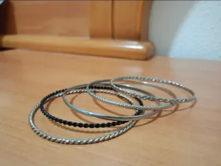 Conjunto de 5 brazaletes finos de bisutería. Incluye 4 pulseras en tono plateado con diferentes texturas (trenzadas y lisas) y 1 pulsera negra trenzada. Ideales para combinar juntas o llevar por separado. Estilo boho / minimalista. Estado: Muy bueno / Poco uso. Color: Plateado y negro. Talla: Única (estándar).