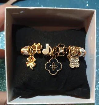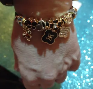 Preciosa Pulsera de Acero y Golfi con muchos dijes colgantes. - Estilo Pandora - Dijes de mariposa, nota musical, flor y trébol. - Diseño con cordón negro con dijes Negros y Dorados, y Pedreria. - Se Envía con Caja, con corazón transparente en el frente.