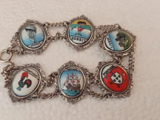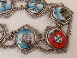 Pulsera con varios dijes de Portugal y Lisboa. - Dijes con escenas y monumentos de Lisboa. - Incluye el escudo de Portugal. - Representación de un barco antiguo. - Diseño de gallo de Barcelos. - Cadena con eslabones.