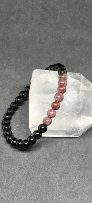 Pulsera con cuentas de granate mineral y obsidiana. - Diseño único con dos tipos de piedras. - Cierre elástico para mayor comodidad. -Minerales de calidad extra. -Bola mide 6mm.